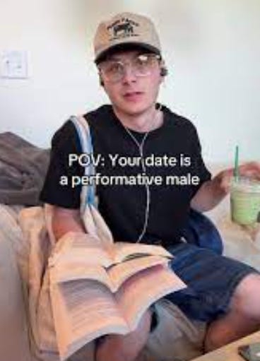 ”Performative man” TikToks exemplify this, really. They’re about achieving a highly coveted spot on the cool people invite list - not because your dad has a yacht, or you work for Penguin Publishing - but because you can convincingly name drop Sartre to people who also haven’t read him.